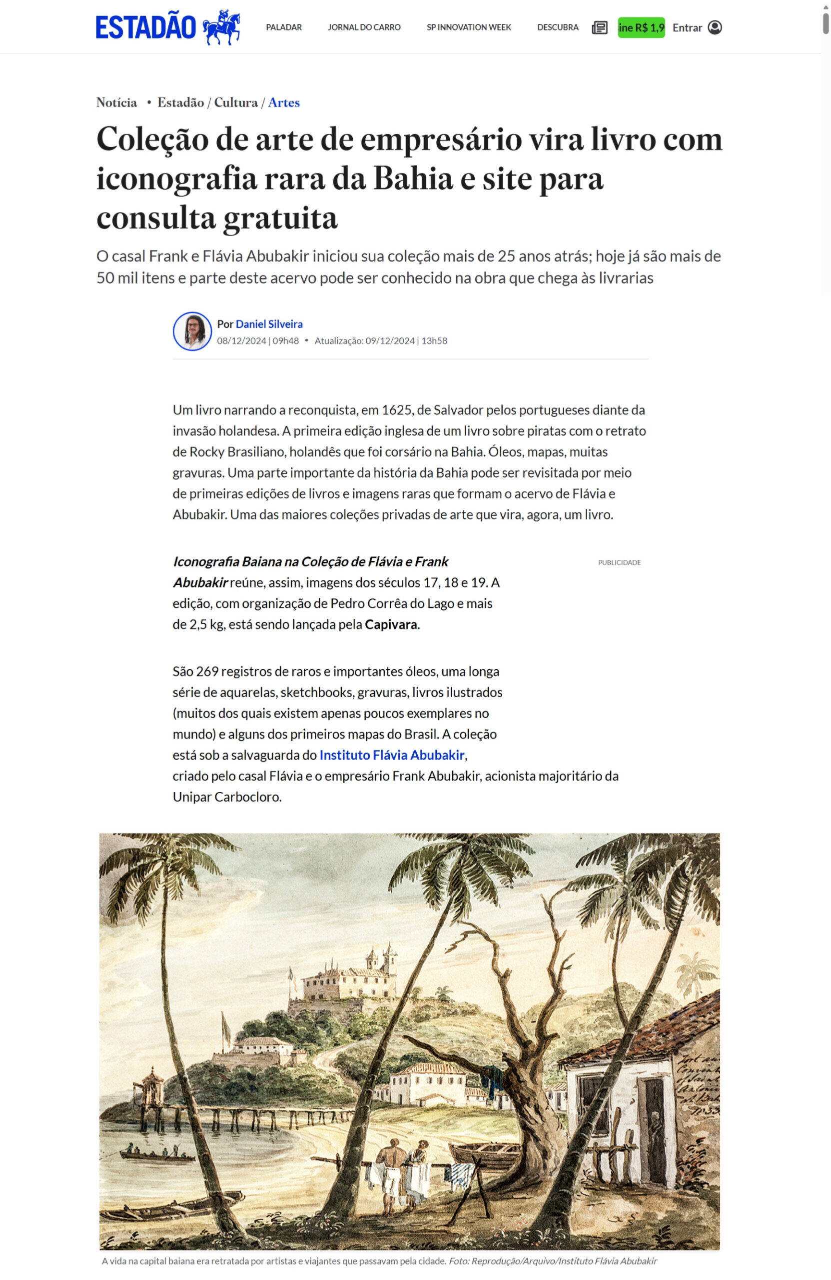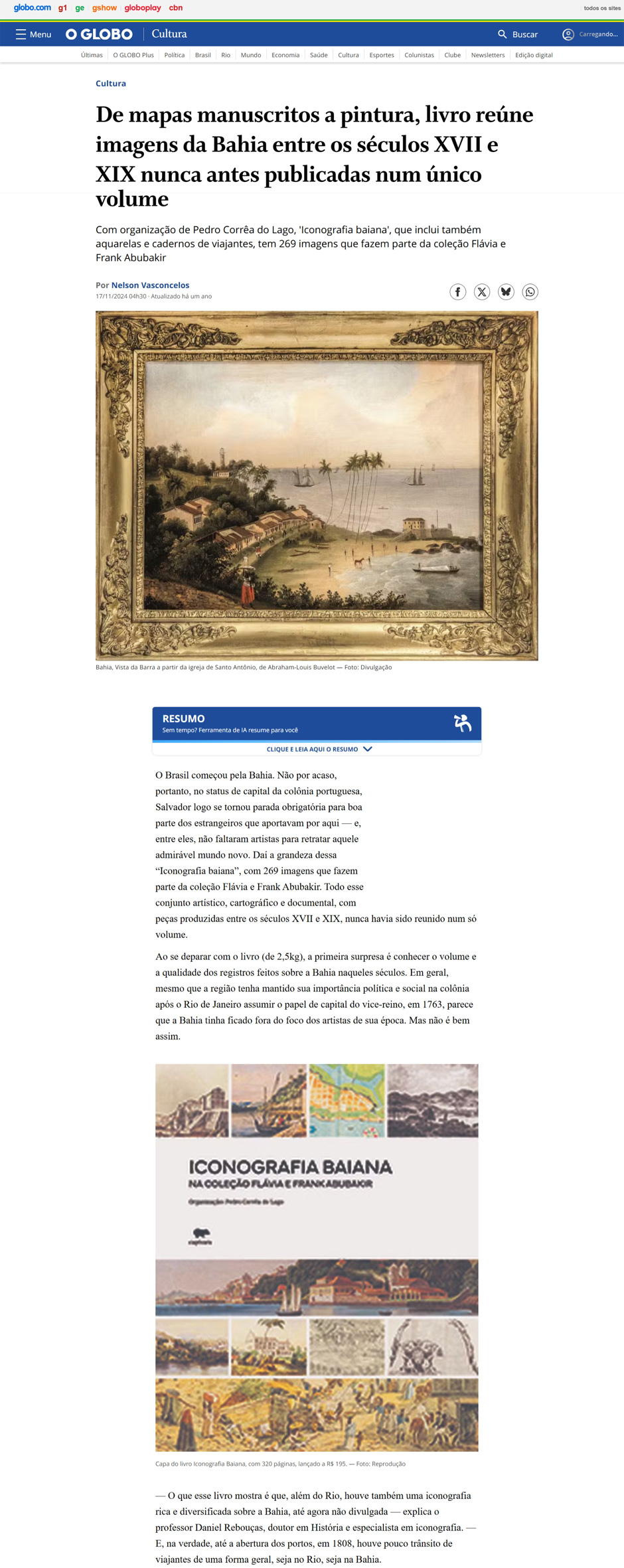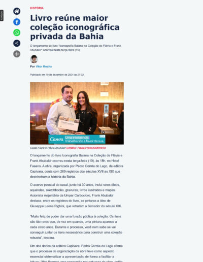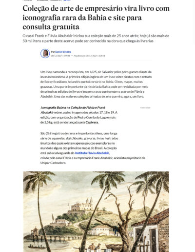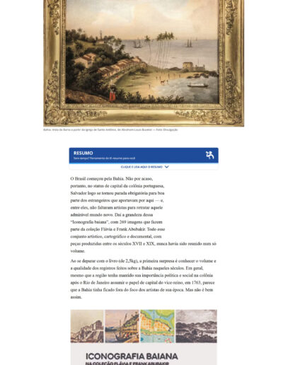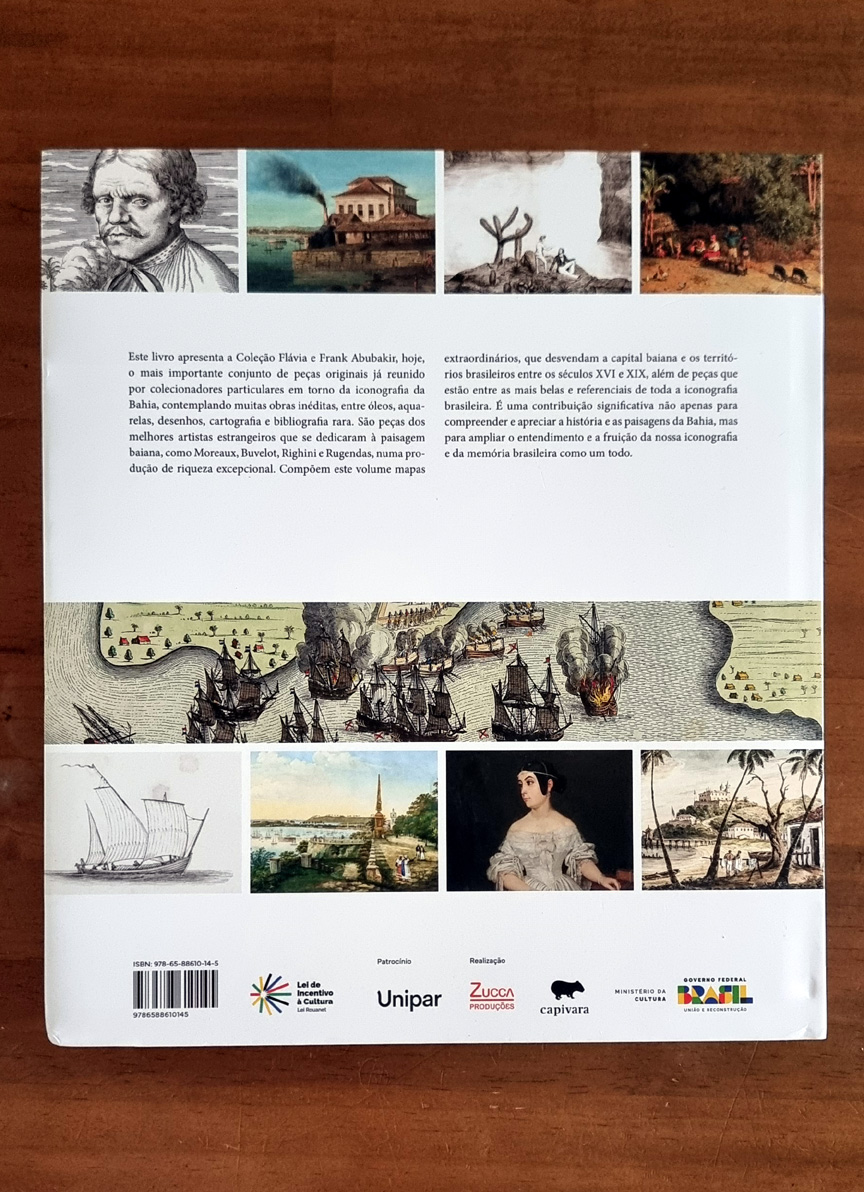 O livro, editado pela Editora Capivara, com organização de Pedro Corrêa do Lago, apresenta ao público um recorte inédito da maior e mais importante coleção privada do país, reunindo a iconografia baiana entre os séculos XVII e XIX. São raros e importantes óleos, uma longa série de aquarelas, sketch books, gravuras, livros ilustrados (muitos dos quais existem apenas poucos exemplares no mundo) e alguns dos primeiros mapas do Brasil, revelando o período de formação do país através dos olhares de viajantes, pintores, exploradores e visitantes.