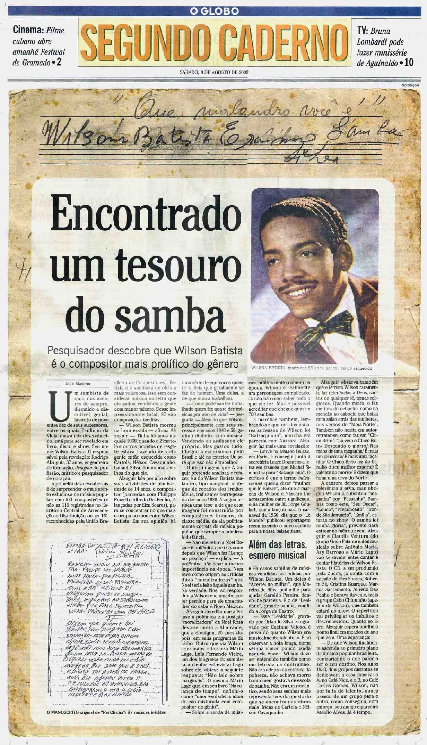 Em “O samba carioca de Wilson Baptista”, a música de Wilson Baptista está em primeiro plano. Suas melodias e letras inspiradas funcionam como diálogos, piadas, narrações, descrições, crônicas e “a partes” – uma prova de que, em se tratando de Wilson, vida e obra sempre andaram, pelas esquinas do Rio de Janeiro, de mãos dadas.
